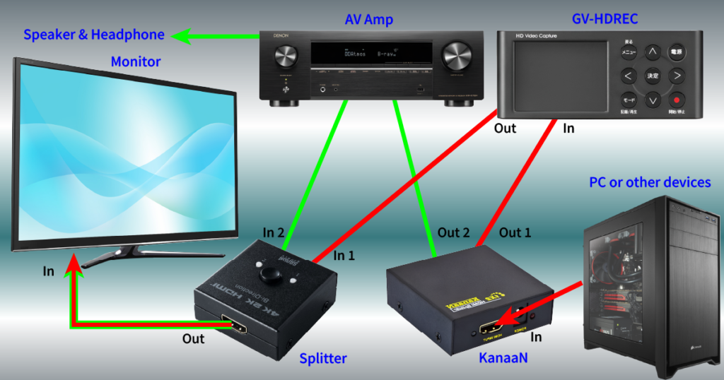 接続図のとおり接続するとAVアンプから音声を出力しつつ、GV-HDRECで映像と音をキャプチャできます